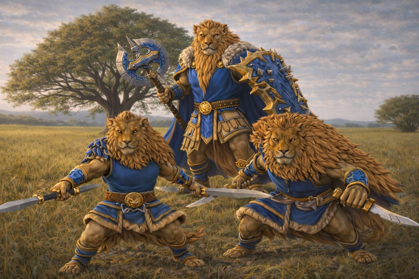 The Lion Beastfolk, known as the Crowned Kin, are ancient creatures whose presence shaped the land before history took form. Born of a living covenant between dominance and duty, they believe rulership is not a privilege, but a burden carried in full view of the world. Their legends trace back to the First Roar, when chaos threatened to consume the land and the first Lion Ancestor rose from the sun-scorched plains, not to conquer, but to still the world through presence alone. From that moment, the Lion learned that order is not seized by force but held through vigilance and restraint.